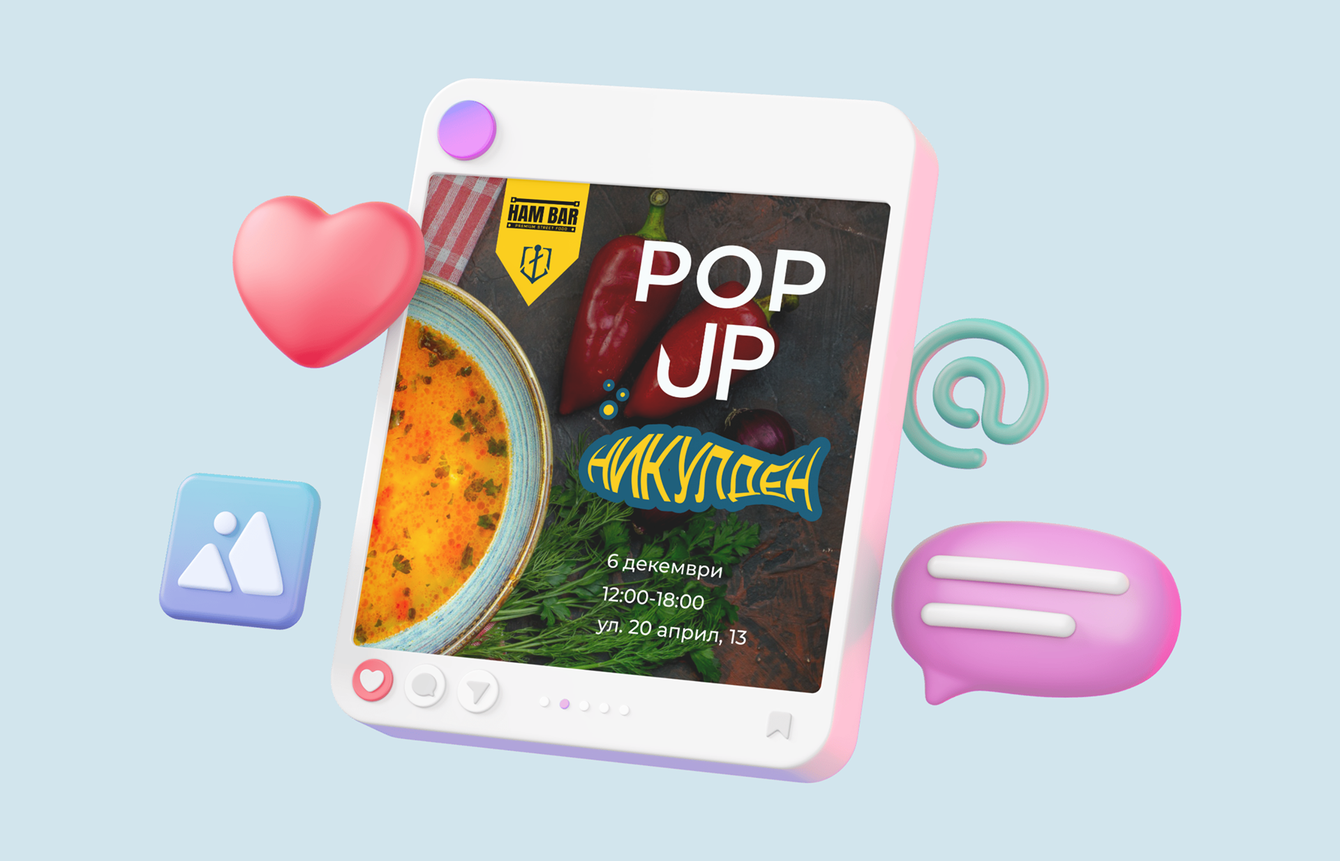 Задачата ми беше да създам пост за обявяването на pop-up за Никулден, в който Стоян Сейменски от Хамбар ще готви рибена чорба, екмек балък.